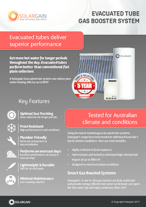 Solargain's range of solar water heaters consist of a high performance range of roof-mounted solar collectors, matched with their range of high quality, technologically advanced hot water storage tanks. Available in two models, with three tank size choices and the option of the 6 star rated continuous gas boosters, solar water heating has never looked so good.